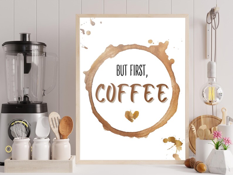- Food-themed prints with retro fonts (“But First, Coffee”)