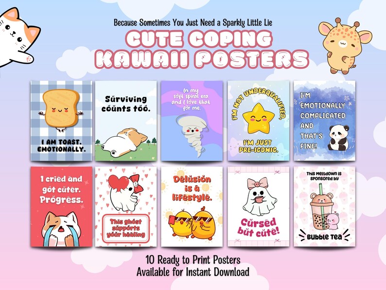 Need more? Our Kawaii Printable Quote Poster Bundle includes 10 emotionally relatable and adorably chaotic designs—featuring sassy affirmations like “I cried and got cuter” and “I’m not underqualified, I’m just pre-iconic.”